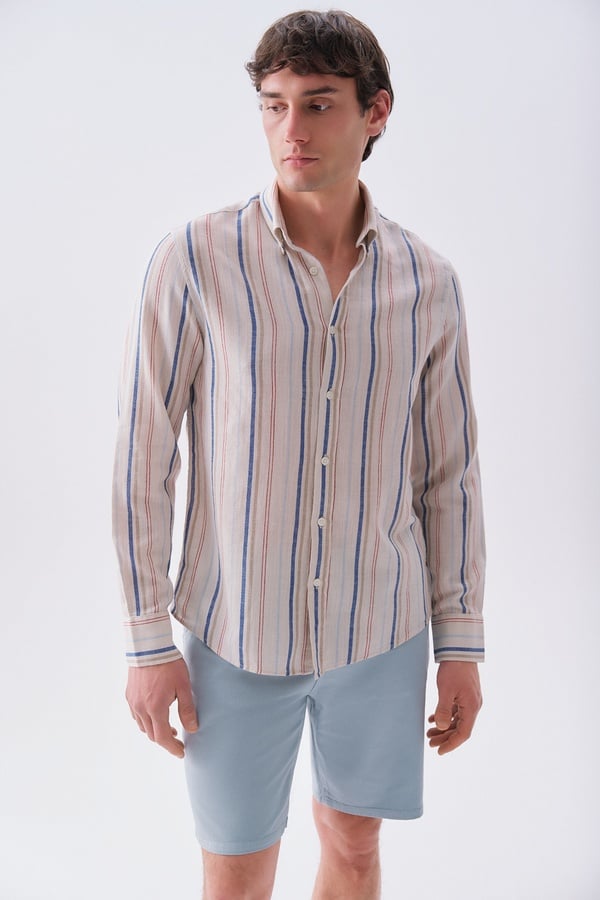 Erkek Beyaz Slim Fit Uzun Kollu Keten Gömlek AÇIK HAKİ