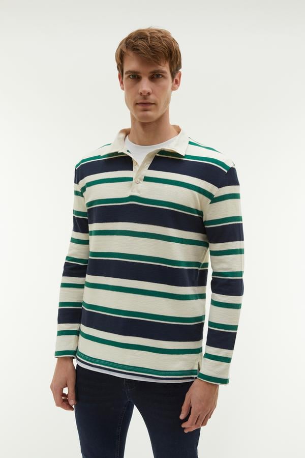 ÇİZGİLİ POLO YAKA TRİKO KAZAK YEŞİL