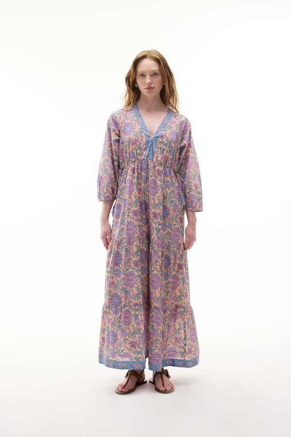 ETNİK BASKILI V YAKA KLOŞ MİDİ ELBİSE