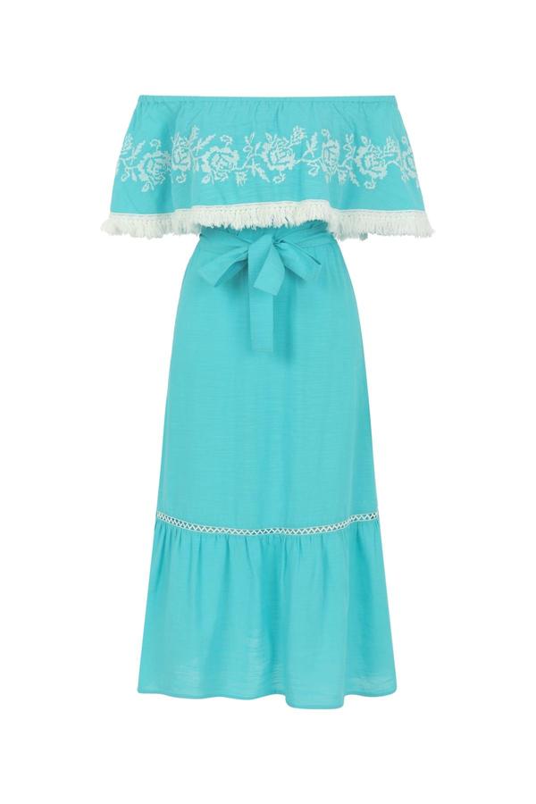 Mudo elbise modelleriyle romantik tavrını yansıt. Carmen yaka tasarımının yanı sıra püskül ve nakışlarıyla etnik stilini tamamlayacak midi elbise, %100 pamuk kumaştan üretilmiştir.