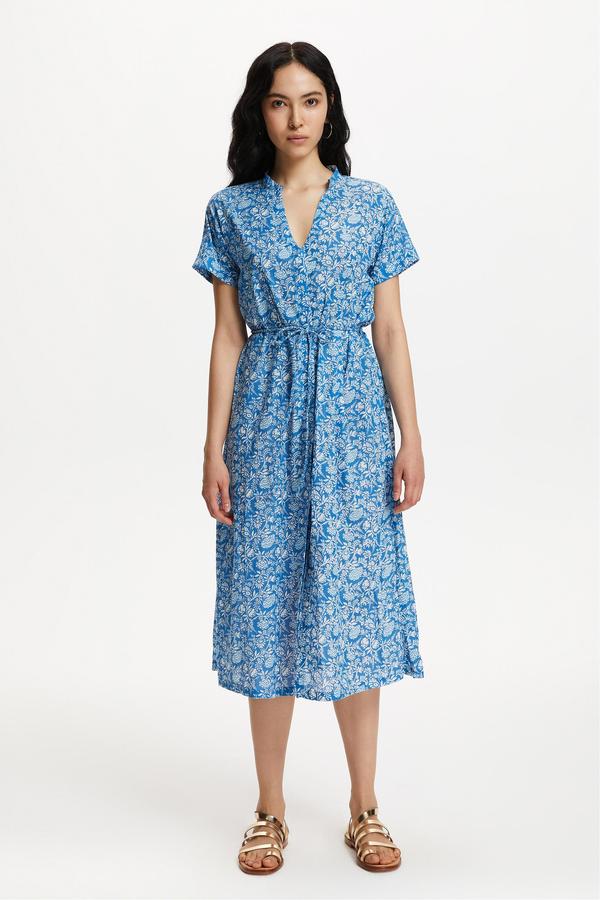 Romantik midi elbise modellerine retro dokunuşlar. Kloş kesimiyle hareketlerine eşlik edecek mavi çiçekli elbise, hakim kesimine derin v yaka dekolteyle yeni bir yorum katıyor.
