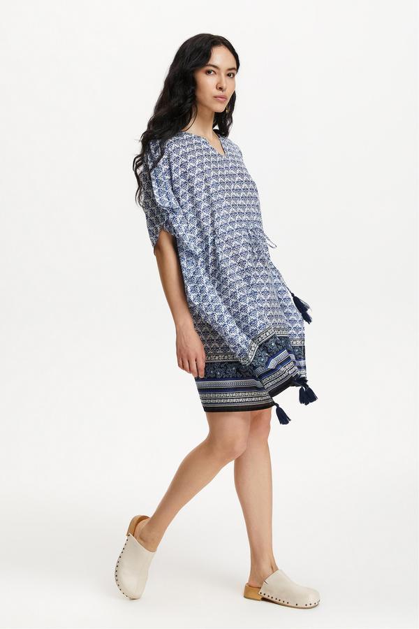 Mudo ile sokak stilini plajlara taşı. Etnik desenli, püskül detayları bulunan mini plaj elbisesi, ip kemerliyle belini ortaya çıkaracak. Sen de sahillerde hareketlerine eşlik edecek bu yarasa kol plaj kıyafeti ile tahta taban terlikler, espadril terlikler ve düz taban terlikleri kombinleyerek rahat ve stil sahibi bir görünüm elde edebilirsin.