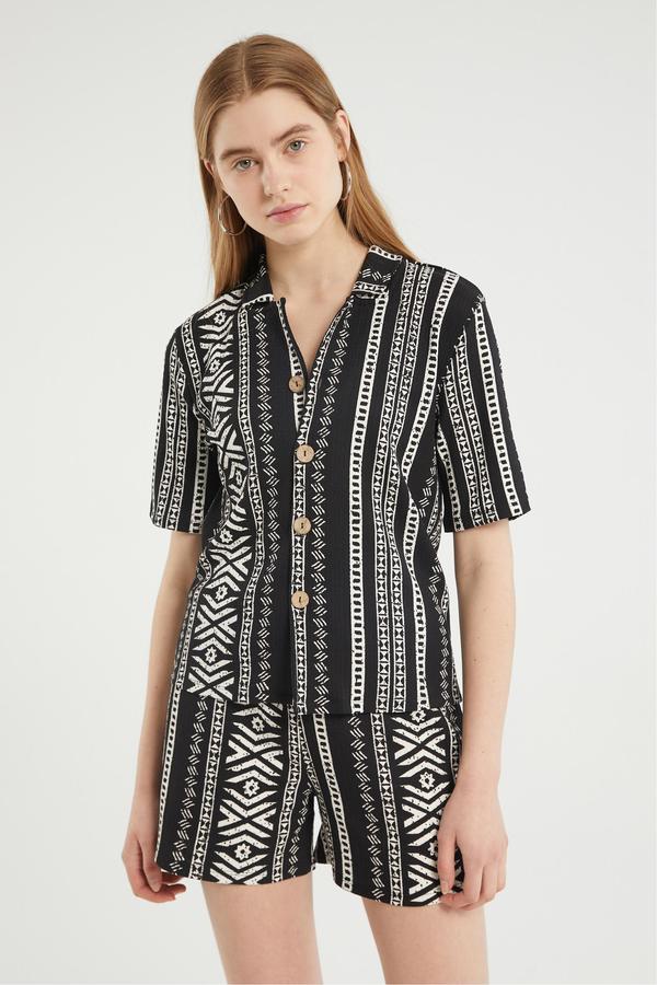 Mudo'da desenli gömlek modelleri ile kombinlerinde özgün detaylar. Desenleriyle etnik detayları barındıran kısa kollu gömlek relax kalıbı ve tahta düğme detayları ile öne çıkıyor.