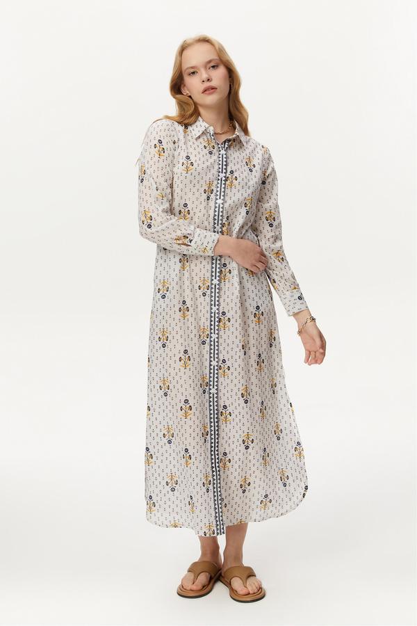 Kadın uzun kollu maxi elbise modelleriyle yaz modasını keşfet. Günlük şıklığında kurtarıcın olacak, etnik desenleriyle hareketlendirilen uzun elbise, %100 pamuklu kumaştan üretilmiştir.