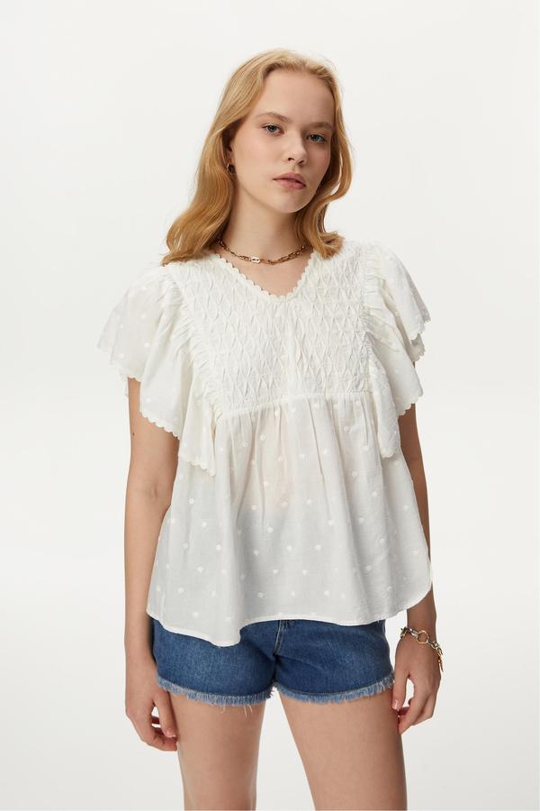 %100 pamuklu kumaştan üretilen kolları volan detaylı bluz ile zarafeti kombinlerine taşı. Cilt dostu kumaşıyla yaz aylarında kurtarıcın olacak kadın bluzu, jean modelleri ile kombinleyebilirsin.