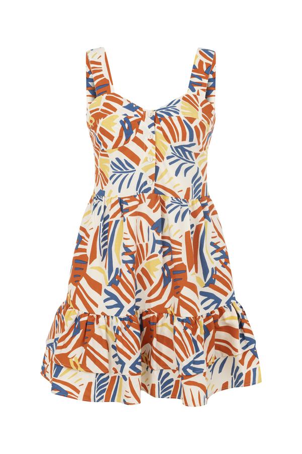 Yaz akşamları dışarı çıkmak isteyenlerin dolabında mutlaka olması gereken parçalardan fırfırlı keten karışımlı mini elbise, yakasındaki kalın askılı kolları ve düğme detaylarıyla tasarıma hareket katıyor.Rahat kumaşıyla üstünde yokmuş gibi hissedeceğin mini elbise, ayakkabı, çanta ve aksesuarlarla kombinlendiğinde her ortam için hazır hale gelebilir.