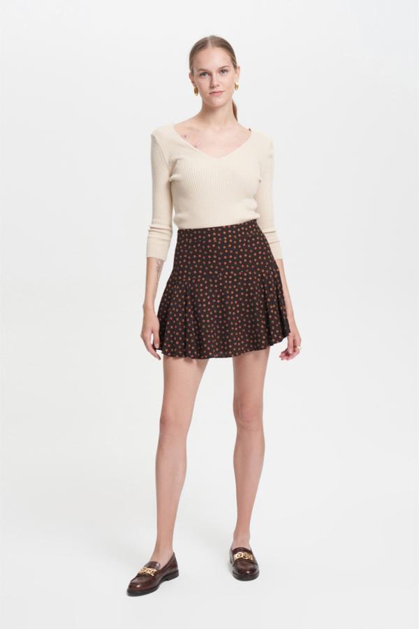 Mudo mini etek modelleri ile hareketlerine ahenk kat... Kloş kesim fırfırlı mini etek, viskoz kumaşıyla öne çıkıyor. Dar bluzlar, crop toplar ile kombinleyebileceğin çiçek desenli mini kloş etek modelini, makosen ayakkabılarla birlikte kullanarak maskülen bir dokunuşla kontrastı kombinlerine taşıyabilirsin.