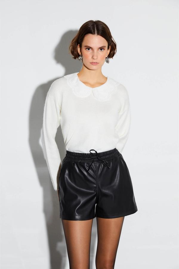 Yalın tavrını tamamlayacak parçalar Mudo'da! Triko rahatlığını fisto işlemeli bebe yaka tasarımıyla yorumlayan triko kazak modelini deri etek, şort ve pantolon modelleri ile kombinleyerek feminen bir dokunuşla tamamlayabilirsin.