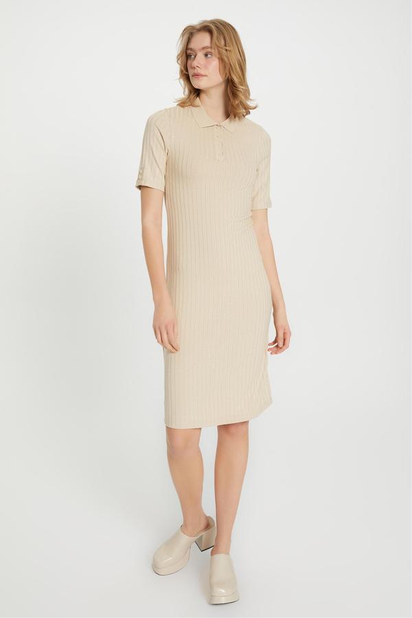 Günlük şıklığında konforu keşfedeceğin polo yaka triko elbise Mudo'da. Fitilli dokusu, polo yaka kısa kollu elbiseyi jean ceketler ile kombinleyebilir, topuklu terliklerle şık bir dokunuş katabilirsin.