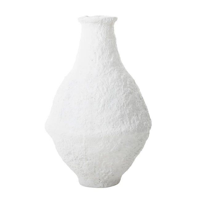 Vazonun en dikkat çekici özelliklerinden biri, pürüzlü ve mat yüzey dokusudur. Bu doku, ürüne doğal bir karakter kazandırır. Dar ağız kısmı ve genişleyen orta bölümüyle kendine özgü bir forma sahip olan Grubyy vazo, mekana modernlik ve sanatsal bir dokunuş ekler. Beyazın zamansız ve nötr etkisi, farklı dekorasyon tarzlarıyla kolayca uyum sağlar; ister renkli çiçeklerle, ister tek bir dal ile ya da boş haliyle dekoratif bir obje olarak kullanılabilir.