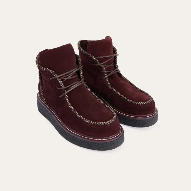 Bordo ve koyu kahverengi tonlarındaki zengin rengi, bronz renkli dikiş detayları ve özel bağcıklarıyla stilini tamamlar. Kalın ve sağlam tabanı, gün boyu konforlu bir kullanım sunarken aynı zamanda adımlarınıza güven katar. Kaliteli işçiliği, botun uzun ömürlü ve zamansız bir parça olmasını sağlar. Farklı kıyafetlerle kolayca kombinlenebilir.
