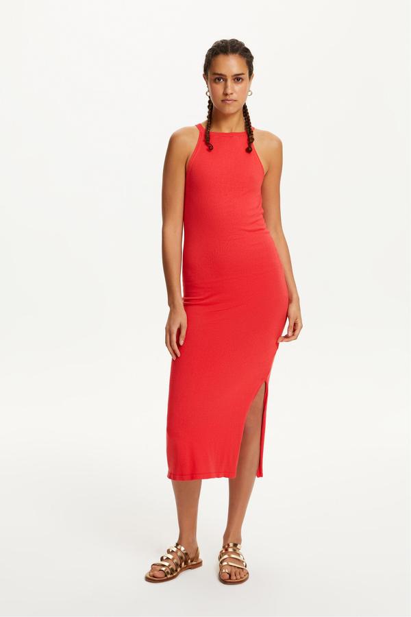 Halter yaka uzun elbise baharın enerjisi kombinlerine taşınıyor. %100 pamuklu kumaştan üretilen, yırtmaç detaylı uzun elbiseyi jean ceketlerle kombinleyebilir, sandalet modelleriyle rahat tavrını stiline taşıyabilirsin.