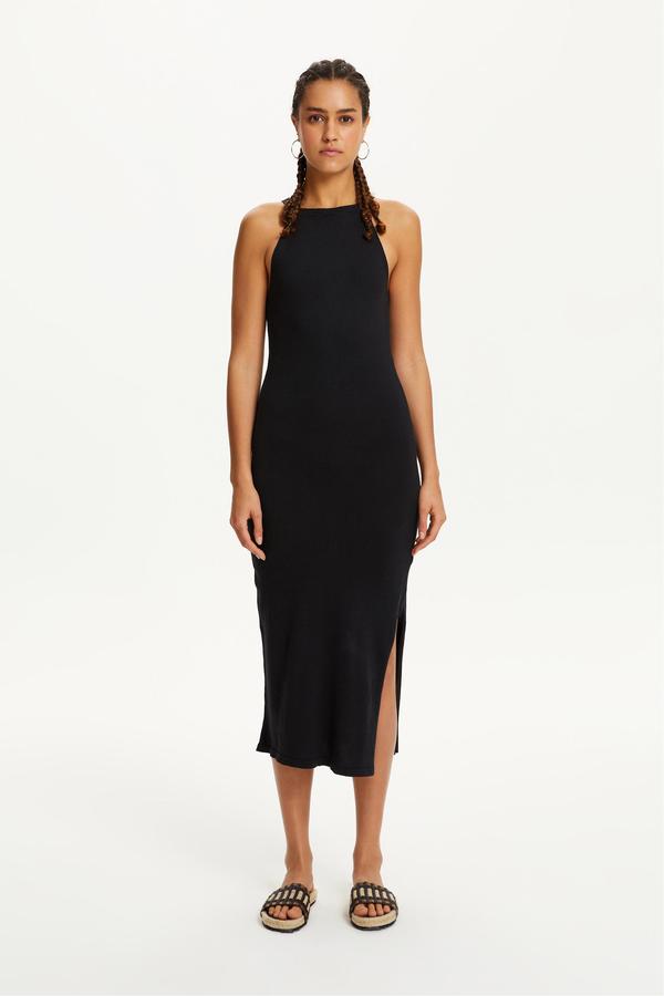 Halter yaka uzun elbise baharın enerjisi kombinlerine taşınıyor. %100 pamuklu kumaştan üretilen, yırtmaç detaylı uzun elbiseyi jean ceketlerle kombinleyebilir, sandalet modelleriyle rahat tavrını stiline taşıyabilirsin.
