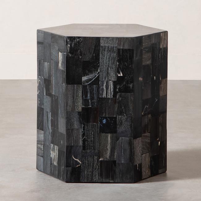 Geometrik formlar, benzersiz malzemelerle buluşuyor. Hexa Yan Sehpa, uzun yıllar toprağın altında bekletilen ve bu sayede minarellerle kendine has mermesimsi görünümünü elde eden fosilleşmiş ahşaptan üretilmiştir. Doğanın büyüleyici estetiğini sergileyen ahşap sehpa, özel malzemesiyle her bir ürünü kendi içinde benzesiz kılıyor.