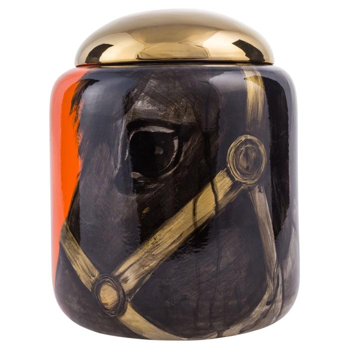 Parlak ve pürüzsüz seramik yüzeyi üzerinde siyah, altın ve turuncu renklerin hakim olduğu soyut fırça darbeleri dinamik bir kompozisyon oluşturur. Tasarımın merkezindeki at gözü detayı objeye derinlik katarken, altın rengi kapak lüks bir bitiş sunar. Bu seramik küp, konsol, sehpa veya kitaplık gibi alanlarda tek başına sergilenerek sanatsal bir atmosfer yaratmak için uygundur. Ev veya ofis dekorasyonunda güçlü bir ifade parçası olarak kullanılabilir.