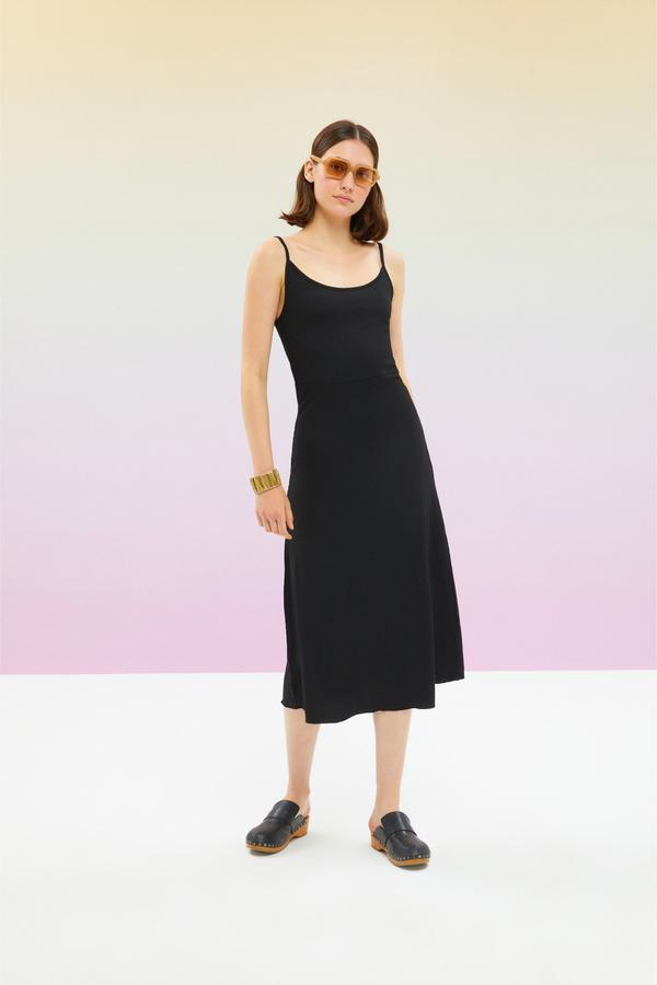 Basic tasarım, siyahın zarafati ile yorumlandı... İnce askılı günlük midi elbiseyi kullanacağın akseauarlarla gece kombinlerine dahil edebilirsin. Alçak topuklu sandaletler ve renkli kolyelerle hareketlendireceğin basic şıklığını, spor ayakkabı ve düz taban terlikler ile şehrin sokaklarına konforu taşıyabilirsin.