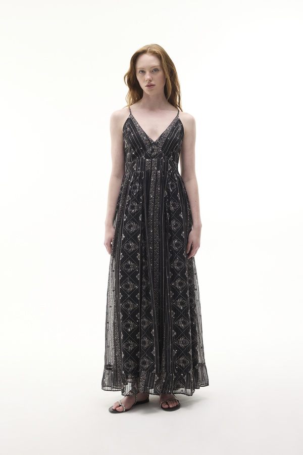 İŞLEMELİ ASKILI KLOŞ MİDİ ELBİSE