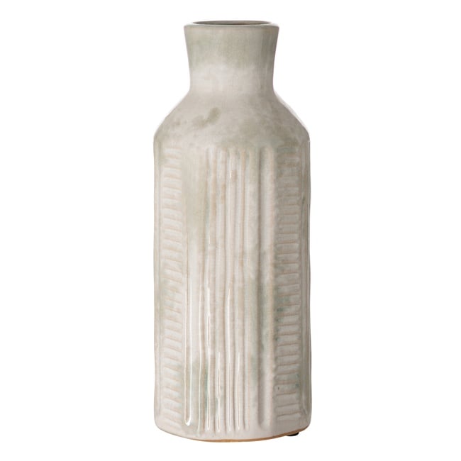 Vazonun yüzeyindeki dikey oluklu desenler, tasarıma dokusal bir zenginlik ve derinlik kazandırır. Daralan silüeti, ona modern ve heykelsi bir form verirken, hafif parlak ve pürüzlü dokusu, ışığı yansıtarak görsel bir odak noktası oluşturur. Hafif çatlaklı görünümü ise her bir parçaya özgün ve doğal bir karakter katar. İster tek başına dekoratif bir obje olarak sergilensin, ister taze veya kuru çiçek aranjmanlarına ev sahipliği yapsın; konsol, orta sehpa veya kitaplık gibi alanlarda sanatsal bir etki yaratır. Bu vazo, mekanınıza estetik bir değer katar.