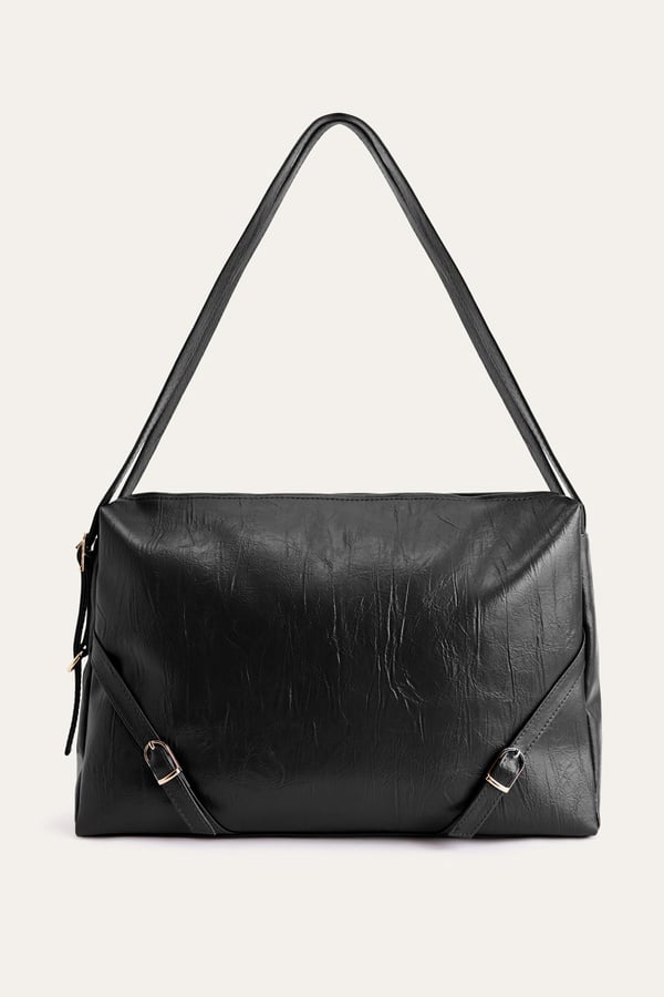 KIRIŞIK DERİ GÖRÜNÜMLÜ KEMER DETAYLI OMUZ ÇANTASI SİYAH