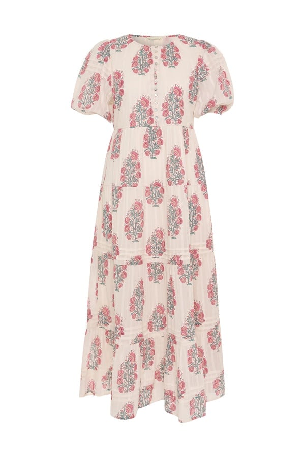 FLORAL BASKILI A FORM MİDİ ELBİSE EKRU