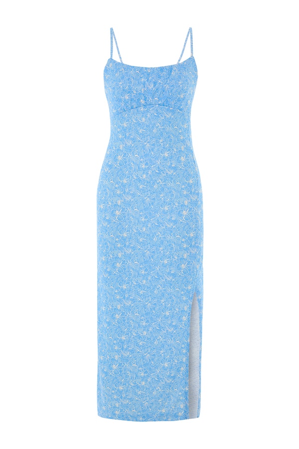 FLORAL BASKILI ASKILI YIRTMAÇLI MİDİ ELBİSE TURKUAZ