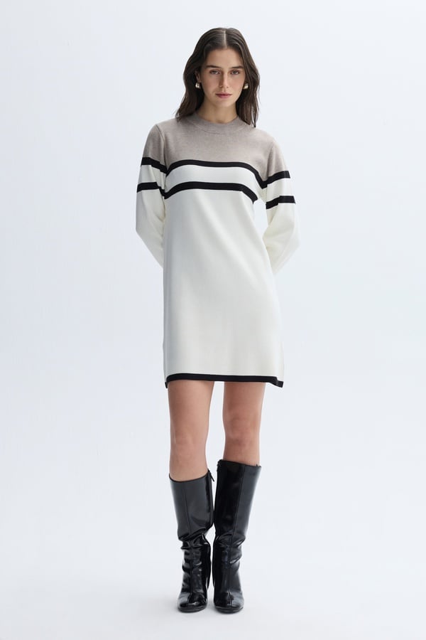 ÇİZGİLİ TRİKO MİNİ ELBİSE EKRU