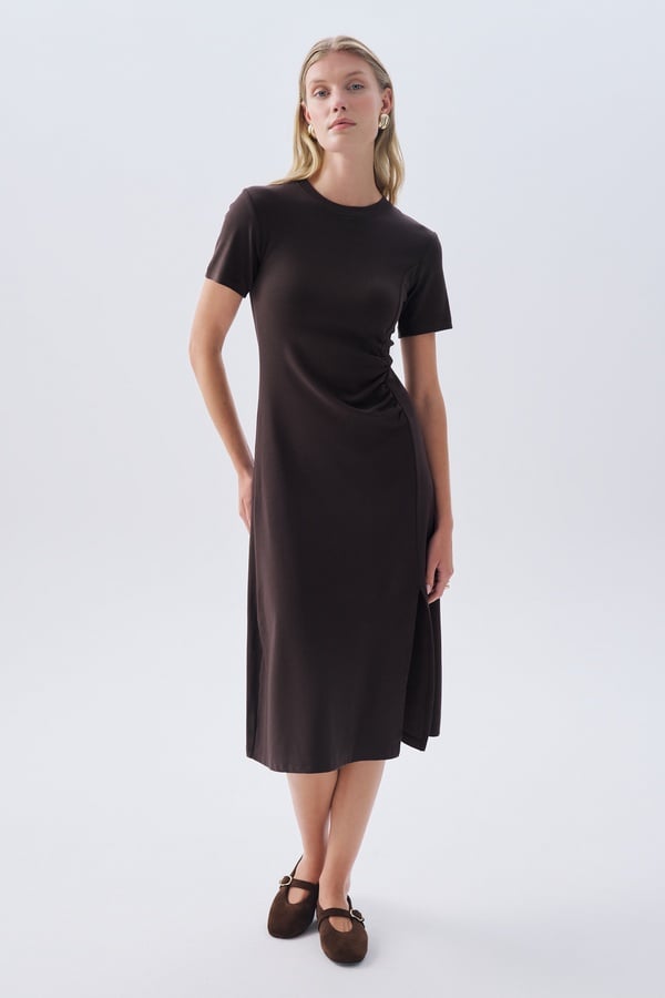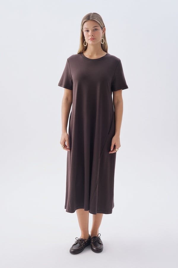 OVERSIZE KISA KOLLU CEPLİ MİDİ ELBİSE KAHVERENGİ