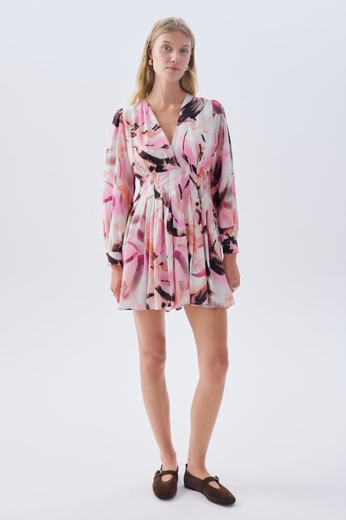 DESENLİ V YAKA MİNİ ELBİSE PEMBE