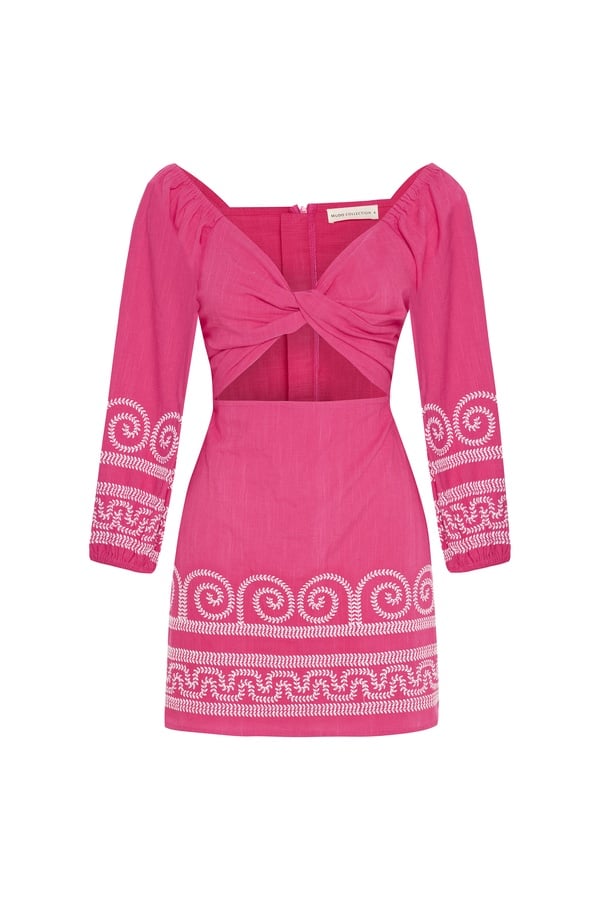 NAKIŞLI BÜZGÜLÜ MİNİ ELBİSE PEMBE