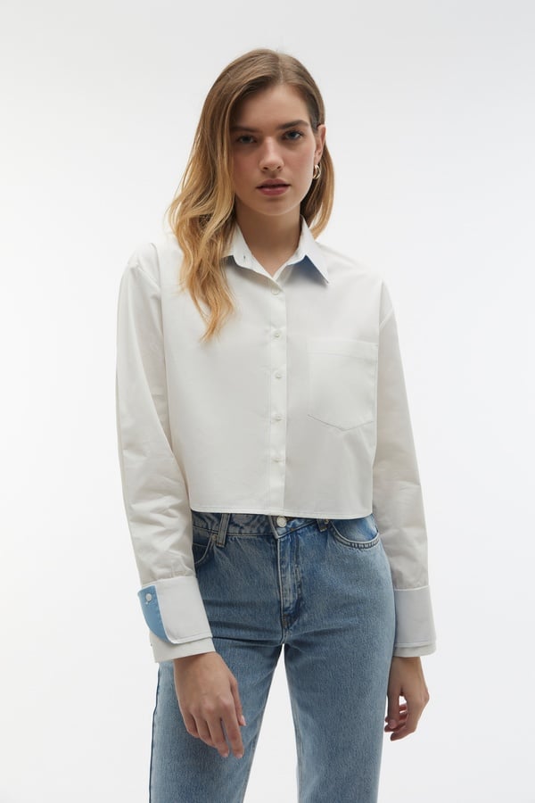 DİKİŞ DETAYLI UZUN KOLLU CROP GÖMLEK KIRIK BEYAZ