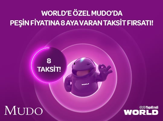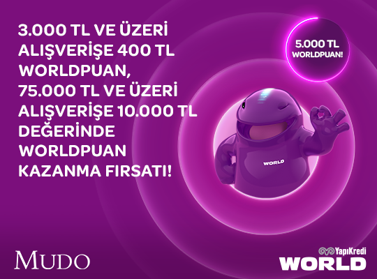 World kampanyası kapsamında 24 Kasım - 31 Aralık 2025 tarihleri arasında Mudo, Mudo Concept ve www.mudo.com.tr’den tek seferde yapılacak 3.000 TL ve üzeri alışverişlere 400 TL Worldpuan, 75.000 TL ve üzeri alışverişe 10.000 TL değerinde Worldpuan kazanılmaktadır. Puan kampanyasına yalnızca bireysel kredi kartı ve debit kart ile yapılan alışverişler için geçerli olup, bir müşteri kampanyadan en fazla 1 kez ve en fazla 10.000 TL Worldpuan kazanabilir.