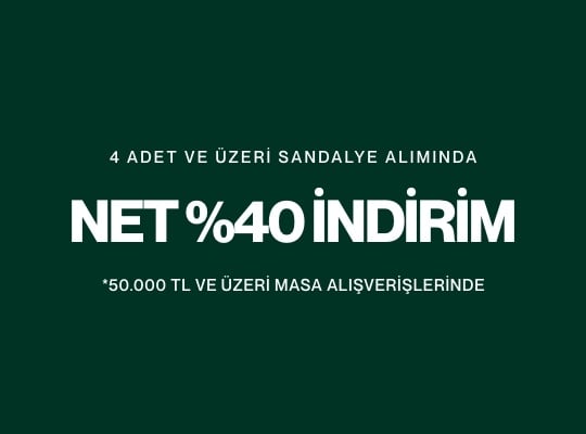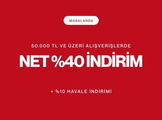 Kampanya 29 Eylül - 5 Ocak 2026 saat 10:00'a kadar geçerlidir. %40 İndirim, 50.000 TL ve üzeri iç mekan masa alışverişlerinde geçerlidir. Dış mekan masalar kampanyaya dahil değildir. Havale indirimi, etiket fiyatı üzerinden %10 olarak uygulanmaktadır. Diğer kampanyalar ile birleşmemektedir. Mudo Concept kampanyayı dilediği zaman durdurma ve/veya kampanya koşullarını değiştirme hakkına sahiptir.