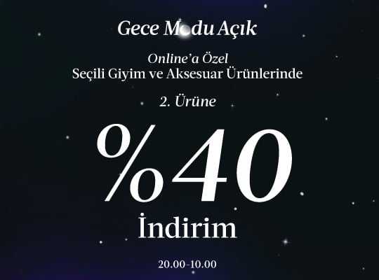 Kampanya, seçili Giyim ve Aksesuar ürünlerinde 4 Aralık Perşembe günü 20:00 - 5 Aralık Cuma 10:00 arasında tüm online kanallarda geçerlidir. Diğer kampanyalarla birleştirilemez. Mudo Kampanya şartlarını değiştirme hakkını saklı tutar.