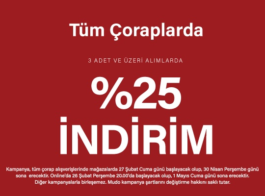 Kampanya, tüm çorap alışverişlerinde mağazalarda 27 Şubat Cuma günü başlayacak olup, 30 Nisan Perşembe günü sona erecektir. Online'da 26 Şubat Perşembe 20:00'da başlayacak olup, 1 Mayıs Cuma günü sona erecektir. Diğer kampanyalar ile birleştirilemez. Mudo Kampanya şartlarını değiştirme hakkını saklı tutar.
