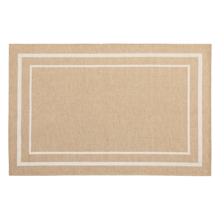Açık bej zemin üzerine işlenmiş çift sıra beyaz bordür detayı, halıya modern bir çerçeve kazandırır. Dokuma deseni, yüzeyine sıcak ve dokunsal bir karakter verirken, her adımda konfor hissini pekiştirir. Oturma odası, yatak odası veya çalışma alanı gibi farklı mekanlarda mobilyalarınızla uyum içinde bütüncül bir dekorasyon oluşturmanıza yardımcı olur.