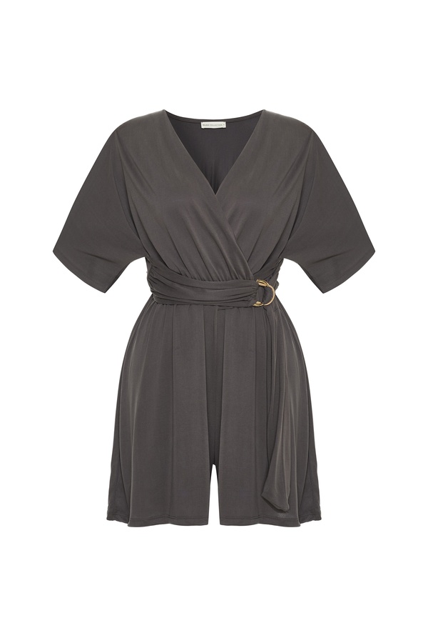 Görünümünüzde tek parçayla tam etki! Kemer detaylı kruvaze yaka mini tulum, klasik tarzla modern dokunuşları bir araya getiriyor. Kruvaze v yaka kesimi sayesinde dekolteyi nazikçe vurgulayarak feminen bir duruş gösteren tulum, belindeki kemer detayıyla vücut hatlarını dengeli ve şık bir şekilde ön plana çıkarıyor. Modal karışımlı kumaşı ile hafif ve dökümlü duran tulum modeli gün boyu konfor ve esnekliği beraberinde getiriyor. İster özel günlerinizde, ister nlük hayatınızda rahatlıkla tercih edebilirsiniz.