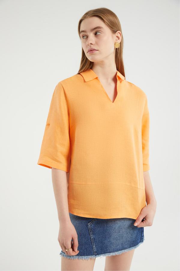 Keten esintisi ile yaz aylarında konforu keşfet. Basic tasarımıyla kombinlerinde zarafeti yansıtacak keten bluz, kumaş kalitesiyle yaz aylarında aradığın rahatlığı sunuyor. Kollarında yer alan düğme detayı ile farklı kullanımları da sunan bluz ile ofis şıklığını tamamlayabilirsin.