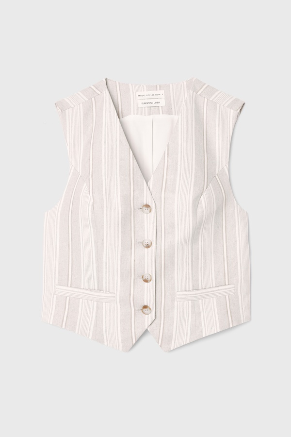 KETEN KARIŞIMLI ÇİZGİLİ KOLSUZ FITTED CEKET