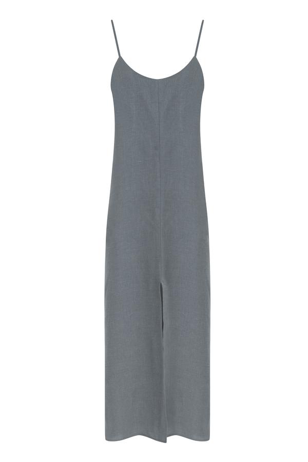 KETEN YIRTMAÇ DETAYLI ASKILI MİDİ ELBİSE