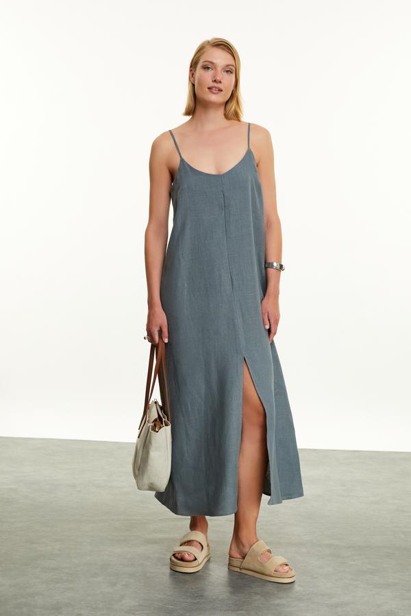 KETEN YIRTMAÇ DETAYLI ASKILI MİDİ ELBİSE