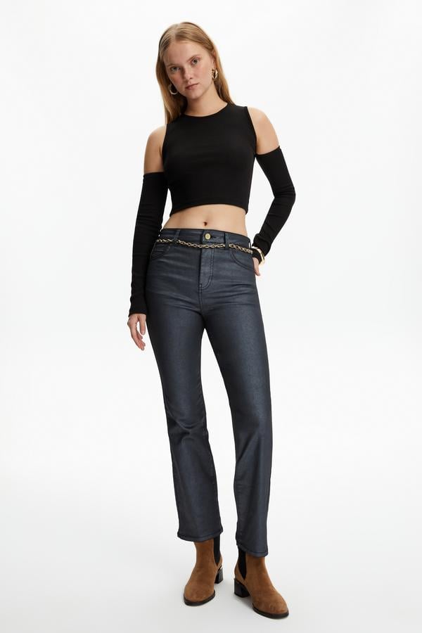 Modern tarzınıza dinamik bir dokunuş katacak mumlu kadın pantolonu keşfet. Mumlu dokusuyla öne çıkan kadın pantolon, kombin özgürlüğü sunan siyah rengiyle tarzına şıklık katacak.
