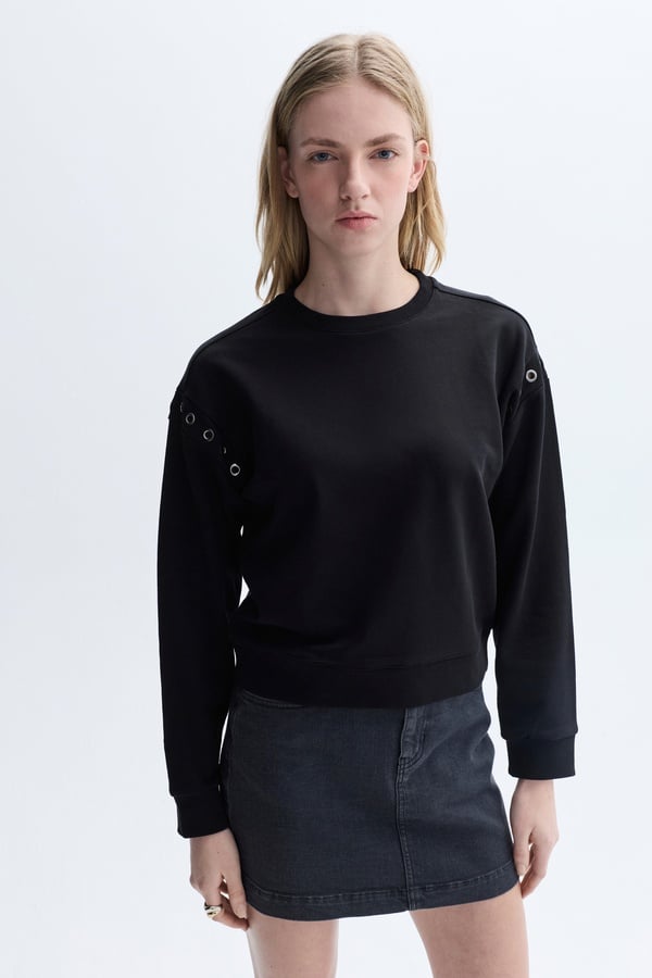 Sade tasarımına modern ve zarif bir duruş sunan kuş gözü detaylı bisiklet yaka sweatshirt, sofistike ve feminen bir dokunuşu beraberinde getiriyor. Pamuklu kumaşı sayesinde cildinize nefes alma imkanı tanıyan ve gündelik konforunuzu bir üst seviyeye taşıyan sweatshirt, zamansız bisiklet yaka tasarımıyla ön plana çıkar. Şık kuş gözü detayları klasik görünümüne hareket katarak modern bir dokunuş sağlarken, sofistike bir tarz oluşturur. Tek başına ya da katmanlı giyimde rahatlıkla tercih edebilirsiniz.