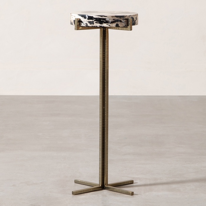 Fosilleşmiş ahşap ile dekorasyonunuzda eşsiz parçalar. Fosilleşmiş ahşap, uzun yıllar toprağın altında oksijensiz bir şekilde bekletilerek minerallerin gücüyle benzersiz ve mermerimsi bir görünüm kazanıyor. Tablasnda bu özel malzeme kullanılan Larry Yan Sehpa'nın ayakları pirinçten üretilmiştir.