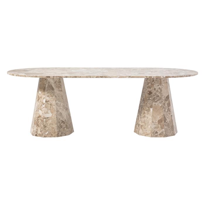Mermerin eşsiz dokusu, dekorasyonunuza dinamik bir dokunuş katacak. Konik formlu ayak tasarımıyla öne çıkan %100 mermer malzemeden üretilen oval yemek masası ile dekorasyonunuzda doğal malzemelerin ihtişamı yer bulacak. Mermerin kendine has renk ve damarlı dokusuyla her üründe benzersizliği sunan, Latte Mermer Masa, Mudo Concept'te.