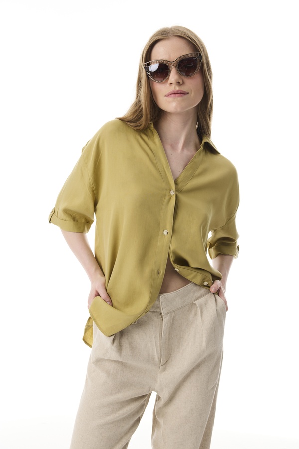 Yaz stilini tamamlayacak kurtarıcı parçalar Mudo'da! Liyosel kısa kollu gömlek ile çabasız şıklığı yakalayabilirsin. Liyosel kumaşın akıcı ve dökümlü duruşu sayesinde zarif bir görünüm elde edebileceğiniz gömlek, kolundaki düğme detayı sayesinde tarzınıza hareket katacak. Havuç pantolonlar ile ofis tarzınıza, jean etekler ile gündelik stilinize uyarlayabilirsiniz.