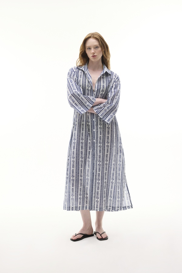 MARİN BASKILI MİDİ GÖMLEK ELBİSE