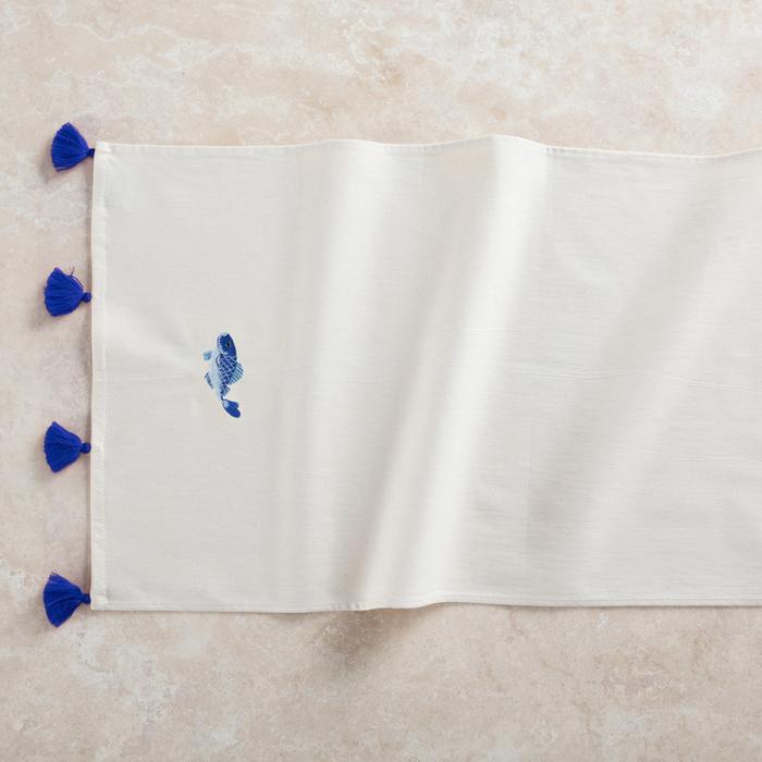 Ürünün ana yüzeyinde yer alan mavi balık deseni, deniz ve doğallık temasını öne çıkarırken, krem ve beyaz tonlarındaki zemin ferah bir görünüm kazandırır. Runner'ın uç kısımlarında bulunan mavi püsküller ise tasarıma hareket ve canlılık katar. Düz dikiş detayları ve doğal dokusu, ürünün genelinde sade ve zarif bir izlenim bırakır. Hafif dokulu yapısı, sofranızda sıcak ve samimi bir atmosfer yaratırken modern dekorasyon anlayışına da uyum sağlar.