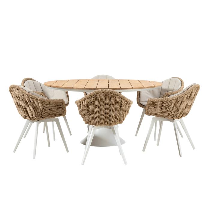 Tasarımın merkezinde yer alan yuvarlak masa tablası, samimi sohbetleri teşvik ederken, sandalyelerin beyaz ayakları modern bir dokunuş katmaktadır. Ergonomik yapıdaki örgülü sandalyeler, konforlu minderleri ile uzun süreli oturumlarda dahi rahatlık sunar. Doğal ve yalın tasarımın birleşimi olan Molde yemek seti, dış mekan dekorasyonunuza zamansız bir zarafet ve konfor getirir.