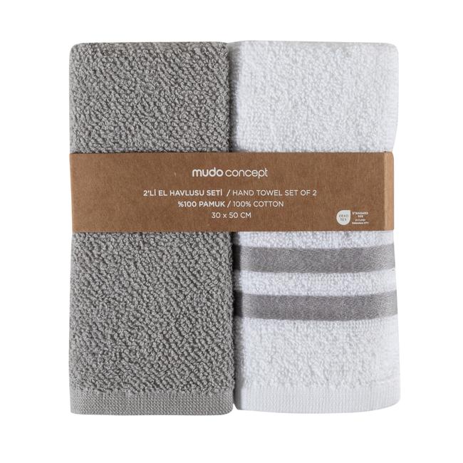 Set içerisinde yer alan biri düz gri, diğeri ise beyaz zemin üzerine gri çizgili desene sahip iki havlu, birbiriyle uyumlu ve modern bir görünüm oluşturur. Nötr renk paleti sayesinde farklı banyo dekorasyonlarına kolayca uyum sağlar. Hem kendiniz hem de misafirleriniz için ideal bir seçenek olan bu havlu seti, banyonuzun atmosferini yenileyerek temizlik ve düzen hissini pekiştirir.