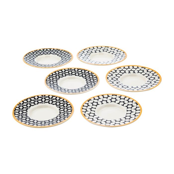 6 adetten oluşan Neo çay tabağı seti ile çay bardaklarınıza ve sunumlarınıza hareket katın. Eskitme detayı verilmiş modern siyah beyaz desenli çay tabağı takımını kullanmaktan vazgeçemeyeceksiniz..
